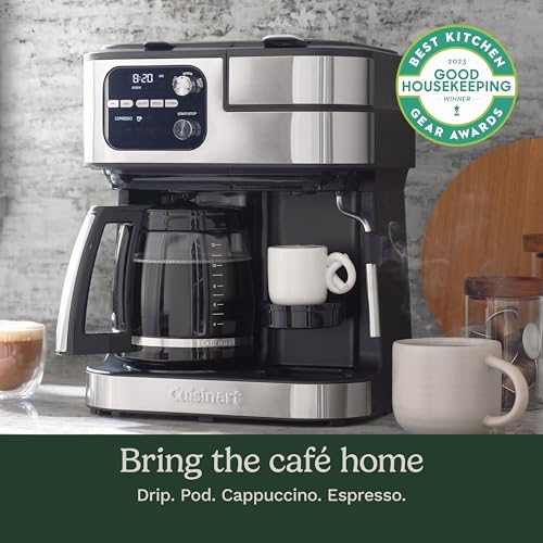 Details: Bring the café home with the Cuisinart® Coffee Center® Barista Bar, and experience four brew options with compact convenience. Serve friends and family with 12 cups of fresh coffee brewed to perfection with programmable time, temperature, and strength settings. Or go solo with single-serve cups, in 6-, 8-, and 10-ounce sizes, made in minutes and compatible with most single-serve pods. For extra-bold flavor, pop in a Nespresso® OriginalLine-style capsule, and enjoy a single or double shot of espresso. Add variety to drinks with the steam wand that makes frothed and steamed milk for cappuccinos, lattes, or the specialty drink of your choice. The wand is also perfect for pouring hot water for tea, matcha, hot cereals, and soups. With sleek modern styling and total versatility, this space-saving all-in-one unit is sure to be the favorite spot in any kitchen.